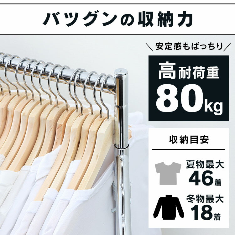 ●商品サイズ(cm) 幅約94×奥行約41×高さ約110〜179 ●材質 スチール(クロームメッキ) ●耐荷重 全体:約80kg ハンガー:約75kg フック:約5kg ●収納の目安 ジャケット等の冬物:約18着 シャツ・ブラウス等の夏物:約46着 ●お客様組立品 ●生産国 台湾