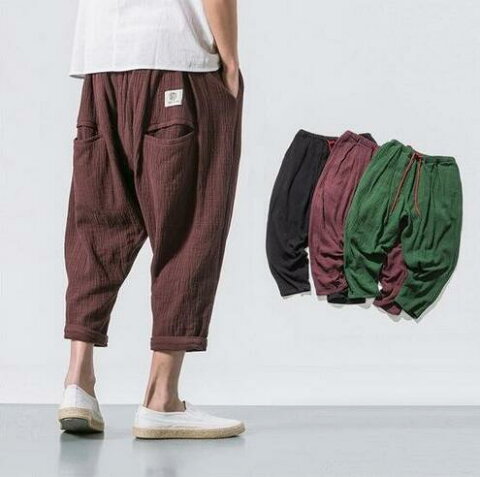 ゆったりメンズサルエルパンツ 大きいサイズ 男性ワイドパンツ 棉麻 7分丈 リネン春夏薄めロング丈ワイドパンツ 棉麻民族風ゆったりガウチョパンツ ポケット 舞台ダンス衣装