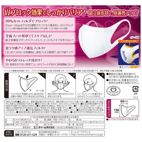 【送料込・まとめ買い×5個セット】【徳用30枚】ユニチャーム 超立体マスク 小さめサイズ 30枚入 かぜ・花粉用 日本製 ホワイト ワイド耳かけ ( 4903111525683)※パッケージ変更の場合あり