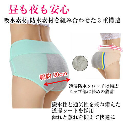 サニタリーショーツ 下着 レディース パンツ ヒップまで大きくカバーするクロッチを採用 異なる素材の3重構造 透湿性・防水性を兼ね備え 蒸れや漏れを最小限に抑えます。